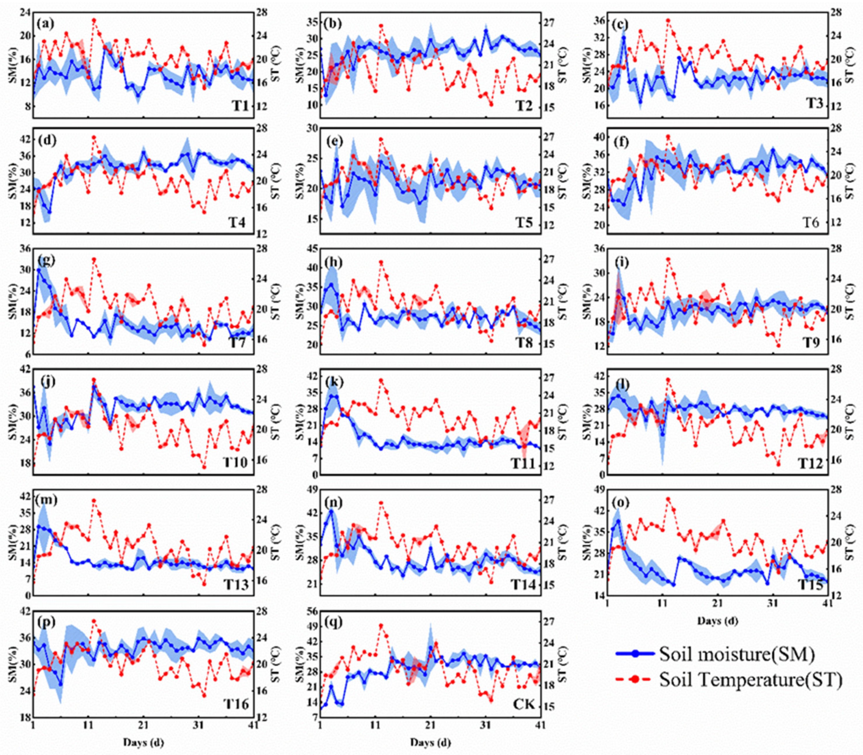 | Soil Moisture Content (%) | Temperature (°C) | PH | Soil Bulk Density (g·cm3) | Clay (g·kg−1) | Sand (g·kg−1) | Silt (g·kg−1) |