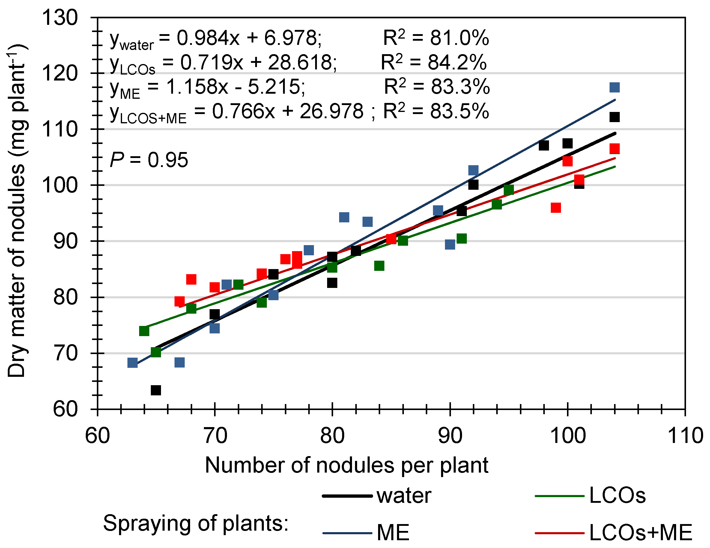 | Dry matter of root nodules (mg per plant)  | 81.1 a | 90.1 b | 87.8 b | 94.4 c | 88.5 | 145.12 | 3 |