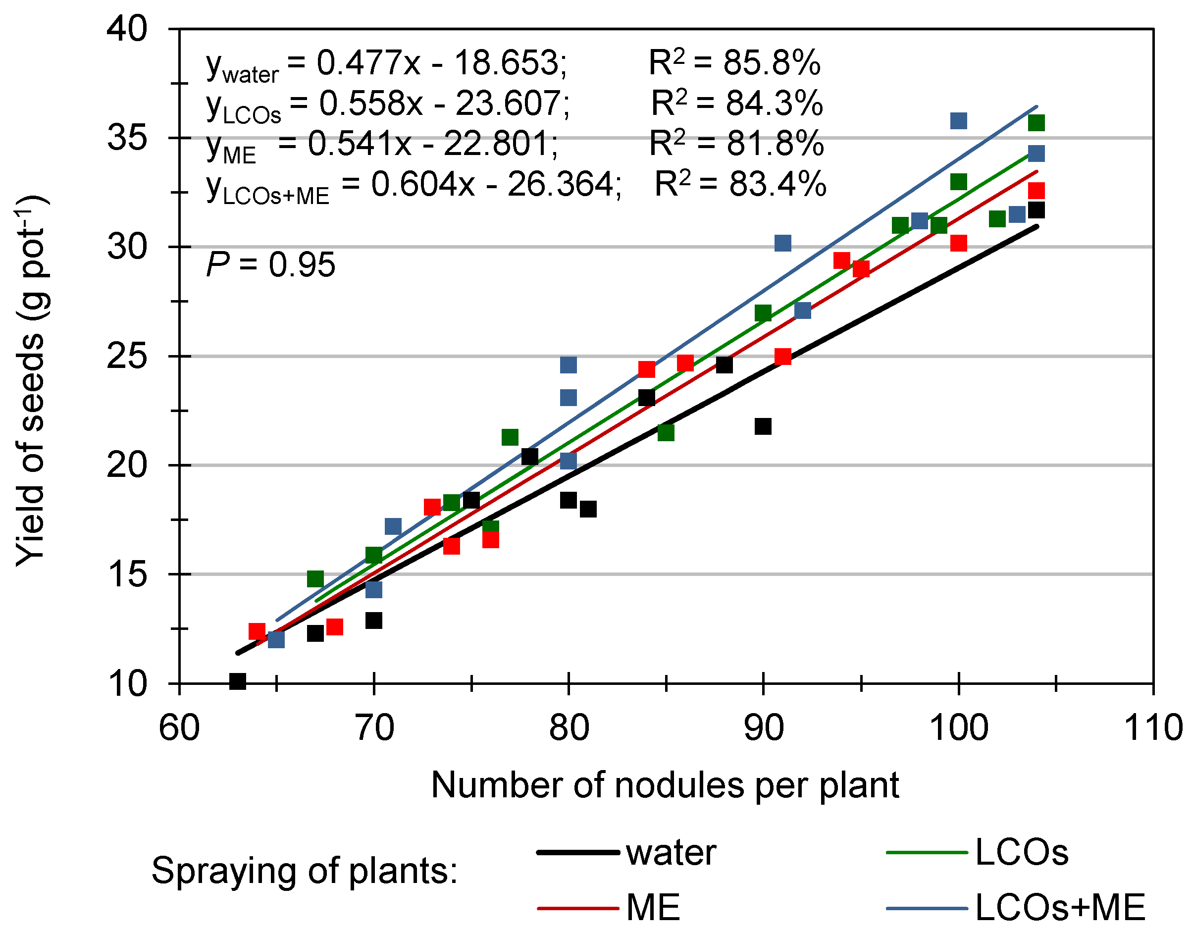- It seems that the simultaneous use of a preparation containing LCOs and microelements has a good synergistic effect. Both (a) an increase in the number of nodules and (b) intensification of metabolic processes were observed, which is probably due to (a) the action of the molecular signal and (b) the provision of numerous cofactors for the most important enzymes and proteins involved in or related to the biological nitrogen fixation process. Nitrogenase activity was not determined; however, a significant increase in nitrogen content in plant tissues was observed after LCOs, ME, or LCOs-ME treatment. As a result, an over 30% seed yield increase was obtained, compared to the control group.