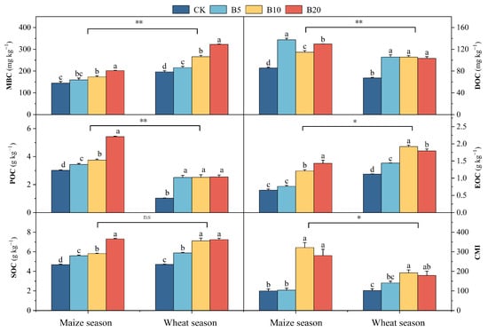 Figure 1. Soil organic carbon fractions and carbon pool management index respond to biochar application in the North China Plain. MBC, microbial biomass carbon; DOC, dissolved organic carbon; POC, particulate organic carbon; EOC, easily oxidizable organic carbon; SOC, soil organic carbon; CMI, carbon pool management index. Significant differences in the measured parameters between cropping seasons are indicated by asterisks (* p ≤ 0.05, ** p ≤ 0.01; ns, p > 0.05). Different lowercase letters indicate significant differences between treatments within the same crop season (p < 0.05). Error bars represent standard error.