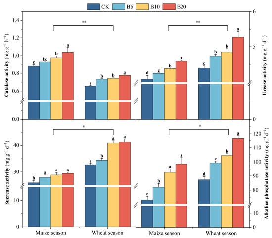 Figure 2. Soil enzyme activities respond to biochar application in the North China Plain. Significant differences in the measured parameters between cropping seasons are indicated by asterisks (* p ≤ 0.05, ** p ≤ 0.01). Different lowercase letters indicate significant differences between treatments within the same crop season (p < 0.05). Error bars represent standard error.