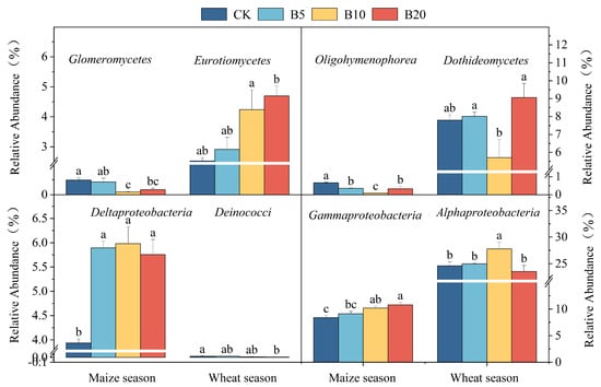 Across both cropping seasons, biochar application significantly stimulated soil enzyme activities (Figure 2). Under B20, CAT, URE, INV, and ALP activities increased by 4.5–18.2%, 3.2–19.8%, 6.1–26.1% and 12.3–33.2%, respectively, compared with CK. Meanwhile, biochar substantially altered microbial community composition (Figure 3). In the wheat season, the abundances of Eurotiomycetes and Dothideomycetes increased by 85.8% and 16.3%, respectively, whereas in the maize season, Glomeromycetes and Oligohymenophorea decreased by 65.3% and 51.6%, respectively. Among bacterial groups, Gammaproteobacteria and Deltaproteobacteria were enriched during the maize season (+29.0% and +46.2%, respectively), while Deinococci and Alphaproteobacteria were suppressed during the wheat season (−74.1% and −4.4%, respectively).