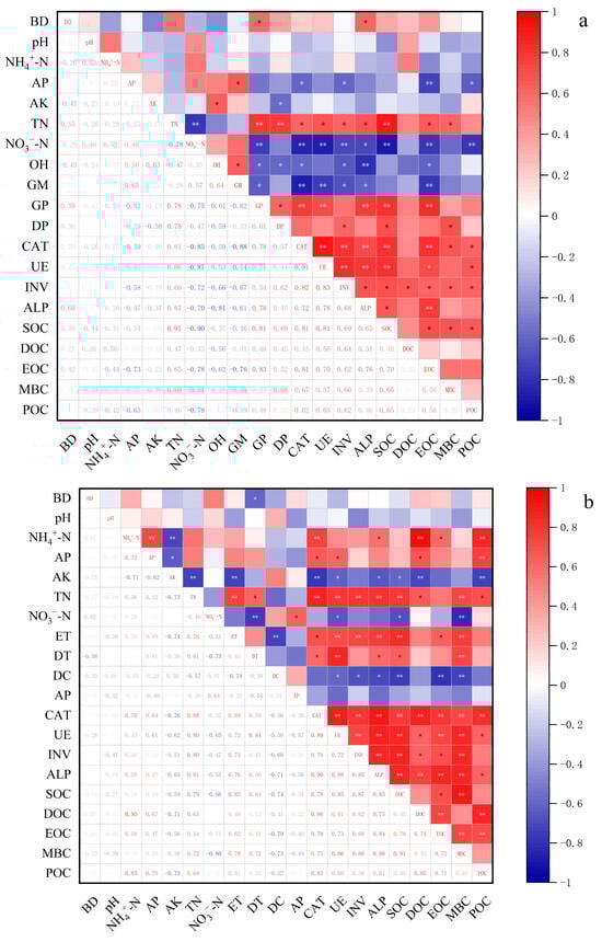 Figure 4. Correlations among soil physicochemical properties, microbial abundance, enzyme activities, and organic carbon fractions in biochar-amended soils of the North China Plain. (a), Maize season; (b), wheat season. BD, bulk density; AP, available phosphorus; AK, available potassium; TN, total nitrogen. ET, Eurotiomycetes DT, Dothideomycetes; DC, Deinococci; AP, Alphaproteobacteria; CAT, catalase; UE, urease; INV, invertase; ALP, alkaline phosphatase; SOC, soil organic carbon; DOC, dissolved organic carbon; EOC, easily oxidizable organic carbon; MBC, microbial biomass carbon; POC, particulate organic carbon. Asterisks mark their significance: * p < 0.05, ** p < 0.01.