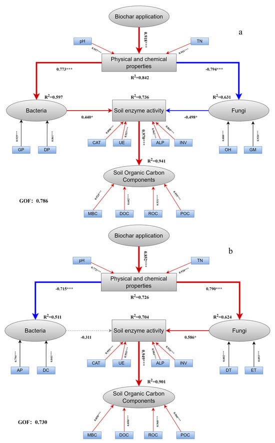 Figure 5. Pathway analysis of soil physicochemical properties, microbial abundance, enzyme activities, and organic carbon fractions in biochar-amended soils of the North China Plain. (a), Maize season; (b), wheat season. TN, total nitrogen; GP, Gammaproteobacteria; DP, Deltaproteobacteria; CAT, Catalase; UE, Urease; ALP, Alkaline phosphatase; INV, Invertase; OH, Oligohymenophorea; GM, Glomeromycetes; AP, Alphaproteobacteria; DC, Deinococci; DT, Dothideomycetes; ET, Eurotiomycetes; MBC, microbial biomass carbon; DOC, dissolved organic carbon; EOC, easily oxidizable organic carbon; POC, particulate organic carbon. Asterisks mark their significance: * p ≤ 0.05,*** p ≤ 0.001. Red line, positive correlation; blue line, negative correlation.