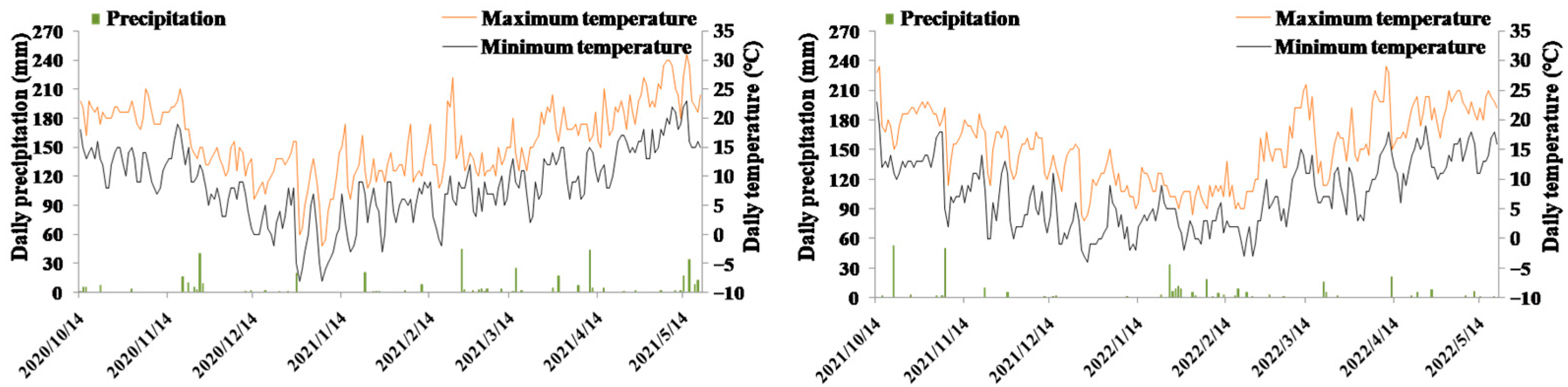 - Zhang, Z.-Z.; Cheng, S.; Fan, P.; Zhou, N.-B.; Xing, Z.-P.; Hu, Y.-J.; Xu, F.-F.; Guo, B.-W.; Wei, H.-Y.; Zhang, H.-C. Effects of sowing date and ecological points on yield and the temperature and radiation resources of semi-winter wheat. J. Integr. Agric. 2023, 22, 1366–1380. [Google Scholar] [CrossRef]