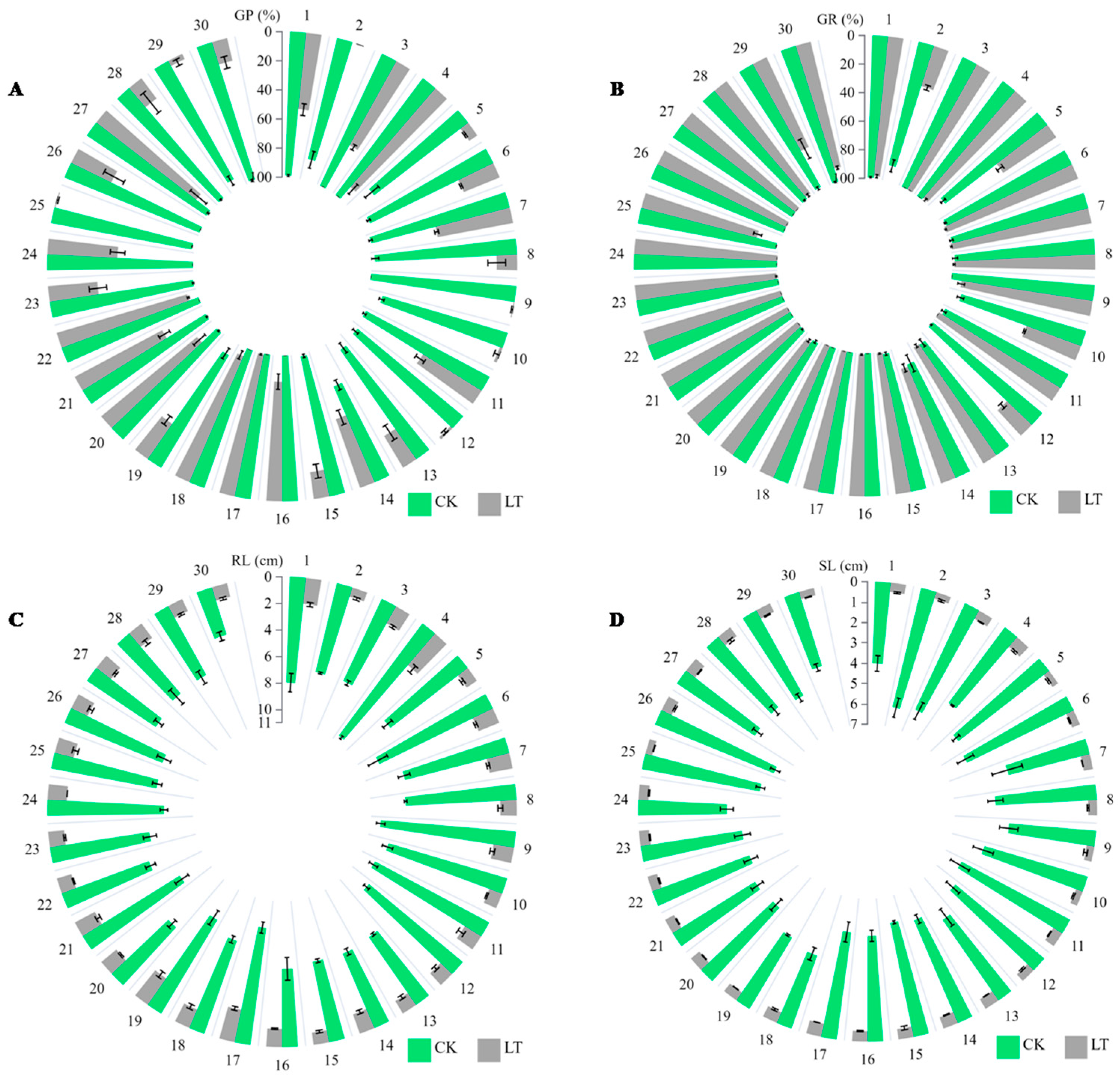 | Genotype (No.) | GP (%) CK | GP (%) LT | RL (cm) CK | RL (cm) LT | SL (cm) CK | SL (cm) LT | GP Reduction (%) |