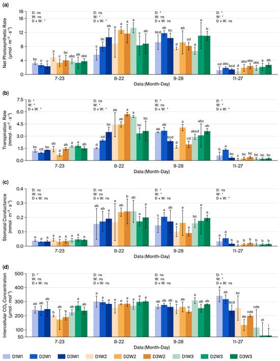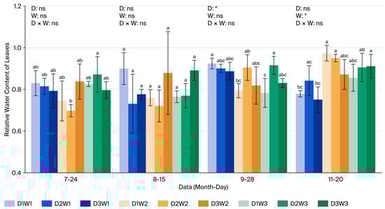 Dynamics of relative water content (RWC) in Nanfeng Tangerine leaves under different irrigation treatments. Notes: In the figure, D represents the irrigation depth factor; W, the irrigation amount factor; and D × W, their interaction. * indicates a significant difference between single factors or interaction effects, while “ns” indicates no significant difference. Different letters in the figure indicate significant differences among treatments at the same time point, whereas the same letters indicate no significant differences among treatments at the same time point. The error bars indicate the standard error (mean ± SE). The same conventions apply to subsequent figures.