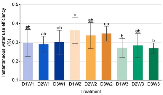 Variation in instantaneous water use efficiency (WUEi) of Nanfeng Tangerine leaves across irrigation treatments.