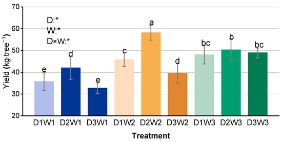 Figure 6 shows the per-tree Nanfeng Tangerine yield under different irrigation treatments. Overall, treatment D2W2 produced significantly higher yields than the other treatments (p < 0.05), averaging 58.13 kg tree−1, which represents a 77.88% increase compared with the lowest-yielding D3W1 treatment (32.68 kg tree−1). Regarding irrigation levels, W2 generally resulted in higher yields than W1 across most depths and was comparable or even superior to W3. For instance, D1W2 and D1W3 yielded 45.77 kg tree−1 and 48.02 kg tree−1, respectively, which are increases of 28.24% and 34.55% over D1W1 (35.69 kg tree−1). Notably, D2W2 outyielded D2W3 by 15.03%, indicating that at 50 cm depth, moderate water deficit can satisfy crop water demand, and additional irrigation does not further increase yield, reflecting the diminishing marginal effect of water utilization. Considering irrigation depth, D2 (50 cm) outperformed D1 (25 cm) and D3 (100 cm), as this depth corresponds to the main root distribution layer of citrus (20–80 cm), facilitating efficient water uptake. Specifically, D2W2 produced 21.26% and 32.01% higher yields than D1W2 (46.23 kg tree−1) and D3W2 (39.52 kg tree−1), respectively. In contrast, deep irrigation at 100 cm performed poorly, especially under W1, and even increasing irrigation to W3 could not surpass D2W2. This suggests that excessive irrigation depth places water beyond the effective root zone, reducing water use efficiency and negatively affecting yield. Linear regression analysis between Nanfeng Tangerine yield and photosynthetic parameters (Figure 7) showed that yield (Y) had R2 values of 0.62 and 0.59 with Pn and Gs, respectively, with a significant positive correlation with Pn (p < 0.05) and an extremely significant positive correlation with Gs (p < 0.05). This indicates that these are key controlling factors for Nanfeng Tangerine yield. In contrast, Y had lower R2 values with Tr (0.34) and Ci (0.39), and their effects on yield were not significant (p > 0.05). In summary, Nanfeng Tangerine yield was highest under D2W2 (58.13 kg tree−1), and leaf Pn and Gs significantly contributed to yield improvement.