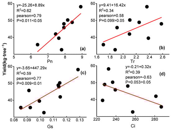 Linear regression analysis of Nanfeng Tangerine yield against photosynthetic parameters (a), (b), (c), and (d) represent the net photosynthetic rate, transpiration rate, stomatal conductance, and intercellular CO2 concentration of Nanfeng Tangerine leaves, respectively.