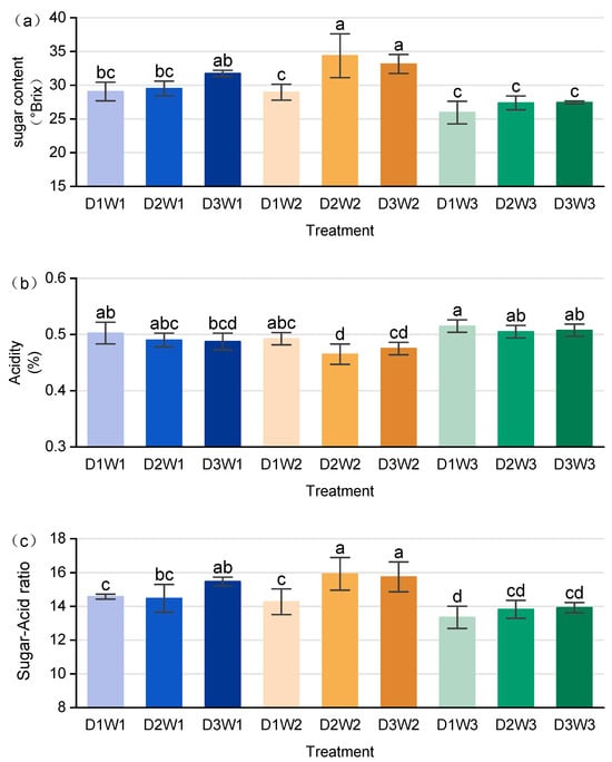 Nanfeng Tangerine quality of different treatment groups ((a), (b), and (c) represent the sugar content, titratable acidity, and sugar–acid ratio of Nanfeng Tangerine, respectively). The error bars indicate the standard error (mean ± SE).