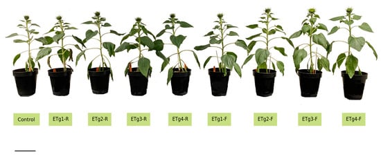 Appearance of sunflower plants at the time of plant sampling. Abbreviations: ETg1-R: Extract Trigonelline 1–Root; ETg2-R: Extract 2 Trigonelline–Root; ETg3-R: Extract Trigonelline 3–Root; ETg4-R: Extract Trigonelline 4–Root; ETg1-F: Extract Trigonelline 1–Foliar; ETg2-F: Extract Trigonelline 2–Foliar; ETg3-F: Extract Trigonelline 3–Foliar; ETg4-F: Extract Trigonelline 4–Foliar. Scale represents 10 cm.