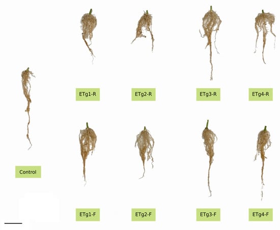 Appearance of sunflower roots at the time of plant sampling. Abbreviations: ETg1-R: Extract Trigonelline 1–Root; ETg2-R: Extract 2 Trigonelline–Root; ETg3-R: Extract Trigonelline 3–Root; ETg4-R: Extract Trigonelline 4–Root; ETg1-F: Extract Trigonelline 1–Foliar; ETg2-F: Extract Trigonelline 2–Foliar; ETg3-F: Extract Trigonelline 3–Foliar; ETg4-F: Extract Trigonelline 4–Foliar. Scale represents 10 cm.