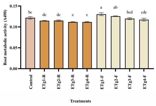 Root metabolic activity. Values are expressed as means ± standard error (n = 8). Columns marked with the same letters were not significantly different based on the LSD test (p < 0.05). Abbreviations: ETg1-R: extract trigonelline 1–root; ETg2-R: extract 2 trigonelline–root; ETg3-R: extract trigonelline 3–root; ETg4-R: extract trigonelline 4–root; ETg1-F: extract trigonelline 1–foliar; ETg2-F: extract trigonelline 2–foliar; ETg3-F: extract trigonelline 3–foliar; ETg4-F: extract trigonelline 4–foliar.