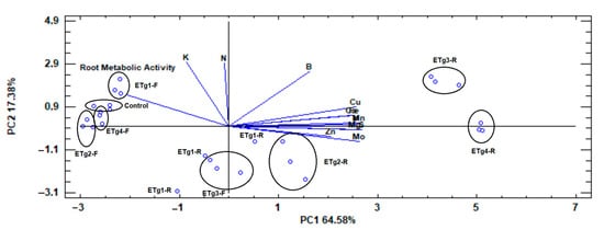 Scores and corresponding loadings plot of principal component analysis (PCA) using the parameters of root metabolic activity and ionomic profile in all treatments. Abbreviations: ETg1-R: extract trigonelline 1–root; ETg2-R: extract 2 trigonelline–root; ETg3-R: extract trigonelline 3–root; ETg4-R: extract trigonelline 4–root; ETg1-F: extract trigonelline 1–foliar; ETg2-F: extract trigonelline 2–foliar; ETg3-F: extract trigonelline 3–foliar; ETg4-F: extract trigonelline 4–foliar; N: nitrogen; P: phosphorus; K: potassium; Mg: magnesium; S: sulfur; B: boron; Fe: iron; Mn: manganese; Mo: molybdenum; Zn: zinc; Cu: copper.