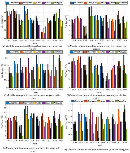 In order to circumvent any potential misinterpretation of variable effects in correlation analysis, a systematic examination of data scale, distribution patterns, and dispersion levels was conducted. This approach led to the identification of extreme values and skewed distributions, thereby elucidating the constraints for subsequent preprocessing and modelling. This step provides baseline references for feature selection, variable transformation, and model robustness assessment. The monthly samples comprise 600 rows, encompassing eight environmental factors. The annual samples comprise 50 rows, representing ten years of annual per-hectare millet yield per unit area across five cities. The missing rate for all variables is zero, thus meeting the conditions for direct modelling. Temperature metrics demonstrate moderate overall dispersion, whilst the three temperature groups for soil and atmospheric measurements share consistent dimensionality, facilitating cross-comparison. The annual per unit area yield demonstrates minimal overall fluctuation, indicating relatively stable regional production. The statistical summaries are presented in Table 1. Corresponding regional distributions across years are visualized in Figure 2.