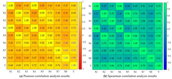 In order to ensure robust data underpinnings for the selection of variables and the design of structures in subsequent per unit area yield prediction models, this section conducts a correlation analysis of the influencing factors. The objectives of this study are threefold: firstly, to identify meteorological and soil factors that most effectively explain the per unit area yield of millet per unit area within the sample; secondly, to clarify the gradient relationship between dominant and secondary factors; and thirdly, to reveal redundancy and potential collinearity among independent variables, with a view to preventing parameter instability and prediction bias arising from information duplication. In consideration of the fact that per unit area yield responses to environmental stresses encompass both approximately linear intensity effects and frequently exhibit monotonic yet nonlinear threshold and saturation characteristics, the present study employs two correlation metrics concurrently. Pearson’s [] and Spearman’s [] models, respectively, characterise linear intensity and order consistency, thereby enhancing interpretability in feature selection while maintaining statistical robustness. The correlation results will guide feature retention and transformation, constrain the hyperparameter tuning search space, and optimise network size and regularization term settings. This establishes a closed-loop relationship between model structure and agricultural mechanisms, laying the groundwork for subsequent generalization testing and uncertainty assessment. The correlation analysis between millet unit per unit area yield and influencing factors is illustrated in Figure 4.