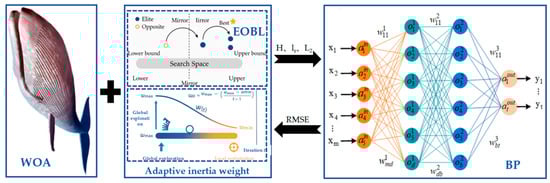 The original WOA relies on a linearly decreasing coefficient, a, to switch between exploration and exploitation. In the context of high-dimensional, non-convex error surfaces, this approach is susceptible to a number of issues, including monotonous step sizes, diminished population diversity, and premature convergence. These issues can result in degraded quality in the context of BP hyperparameter optimisation [,,]. In order to address the aforementioned issues, this paper introduces two complementary mechanisms into WOA. The following terms are employed in this text: adaptive inertia weight [] and elite opposition-based learning (EOBL) []. These mechanisms are designed to balance global exploration with local digging, thereby mitigating local optima. The calculation formulas employed are as follows: