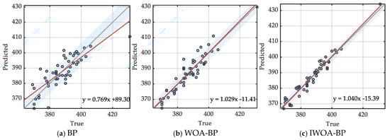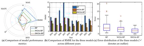 As demonstrated in Table 2 and Figure 7 and Figure 8, the IWOA-BP model exhibits a marked superiority. The full-sample RMSE is 2.74, MAE is 2.27, MAPE is 0.59, R2 is 0.941, and the RPD is 4.16. The WOA-BP model is positioned in the intermediate category, with an RMSE of 4.31, an R2 of 0.854, and an RPD of 2.65. The baseline BP demonstrated the poorest performance. RMSE is 6.56, R2 is 0.662, and the RPD is 1.74. In comparison with the baseline BP, WOA-BP reduced RMSE by 24.4%, while IWOA-BP reduced it by 58.3%. Furthermore, relative to WOA-BP, IWOA-BP reduced RMSE by a further 36.4%. The MAPE for all three models remained below 1.4%, with IWOA-BP consistently around 0.6%.
