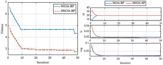 Hyperparameter tuning boundaries were consistent. The hidden layer node counts ranged from 5 to 40, the learning rates from 1 × 10−3 to 1 × 10−1, and the regularization coefficients (reg) from 0 to 0.10, with a maximum of 50 iterations. The population sizes for WOA and IWOA were set to 20. BP employed Levenberg–Marquardt training with early stopping and weight decay enabled. The output fitness convergence curves were utilised to compare optimisation speed and stability. Three-dimensional hyperparameter trajectories illustrate divergence in convergence paths. The utilisation of composite radar charts facilitates a comprehensive evaluation of the performance across a range of metrics, including RMSE, R2, MAE, MAPE, and RPD. Scatter plots of validation data points overlaid on a unit line and a least-squares fitted line provide the slope, intercept, and correlation coefficients.