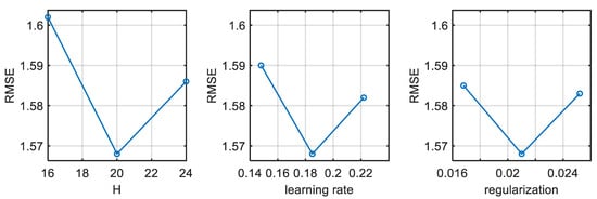 Hyperparameter sensitivity of RMSE to H, learning rate, and regularization.