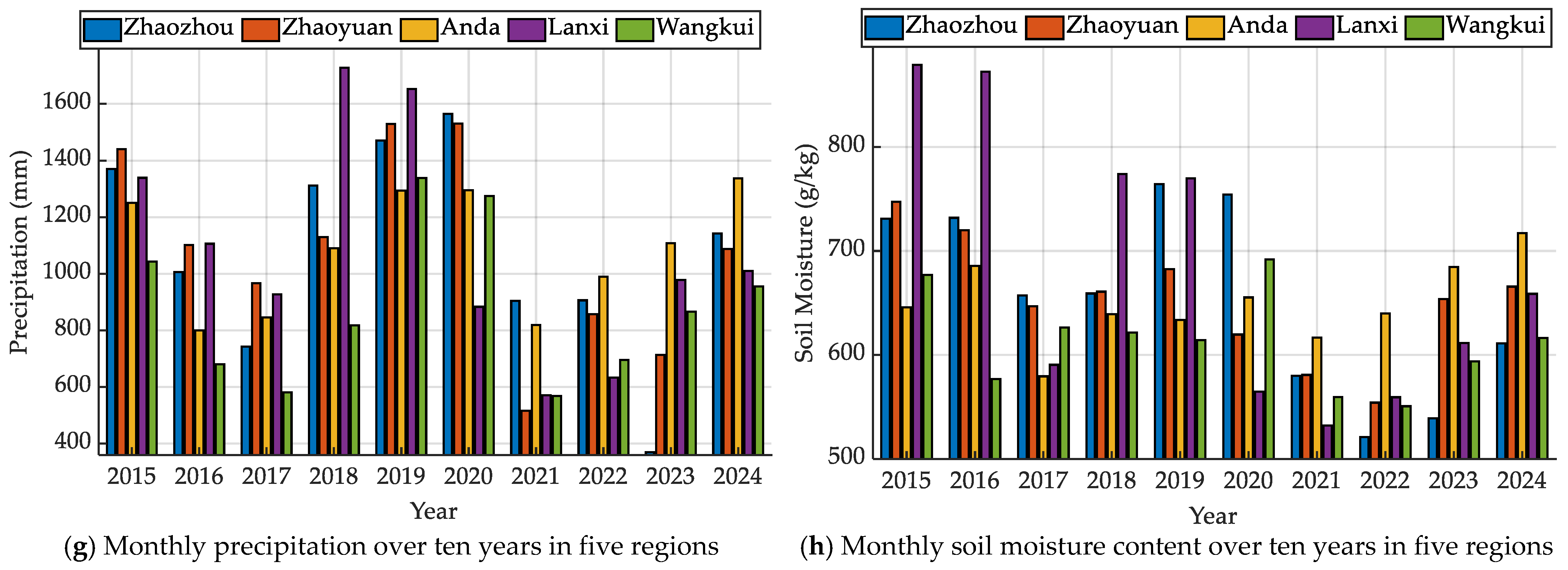 In summary, the rainfall amount and soil moisture demonstrate clear asymmetric and long-tailed distributions. In order to mitigate the driving effect of extreme values, it is necessary to implement a logarithmic or square root transformation, in conjunction with robust outlier removal and standardization. Furthermore, given the comparable variance of temperature factors and their closely interlinked physical relationships, subsequent attention should be paid to multicollinearity. This issue can be addressed through feature dimension reduction or regularization constraints, which are effective in preventing parameter instability. It is recommended that time-lag structures for rainfall and soil moisture be incorporated into subsequent models in order to take into account the mechanisms of production. In order to mitigate the impact of spatiotemporal heterogeneity on evaluation outcomes, stratified cross-validation by city or year should be implemented.