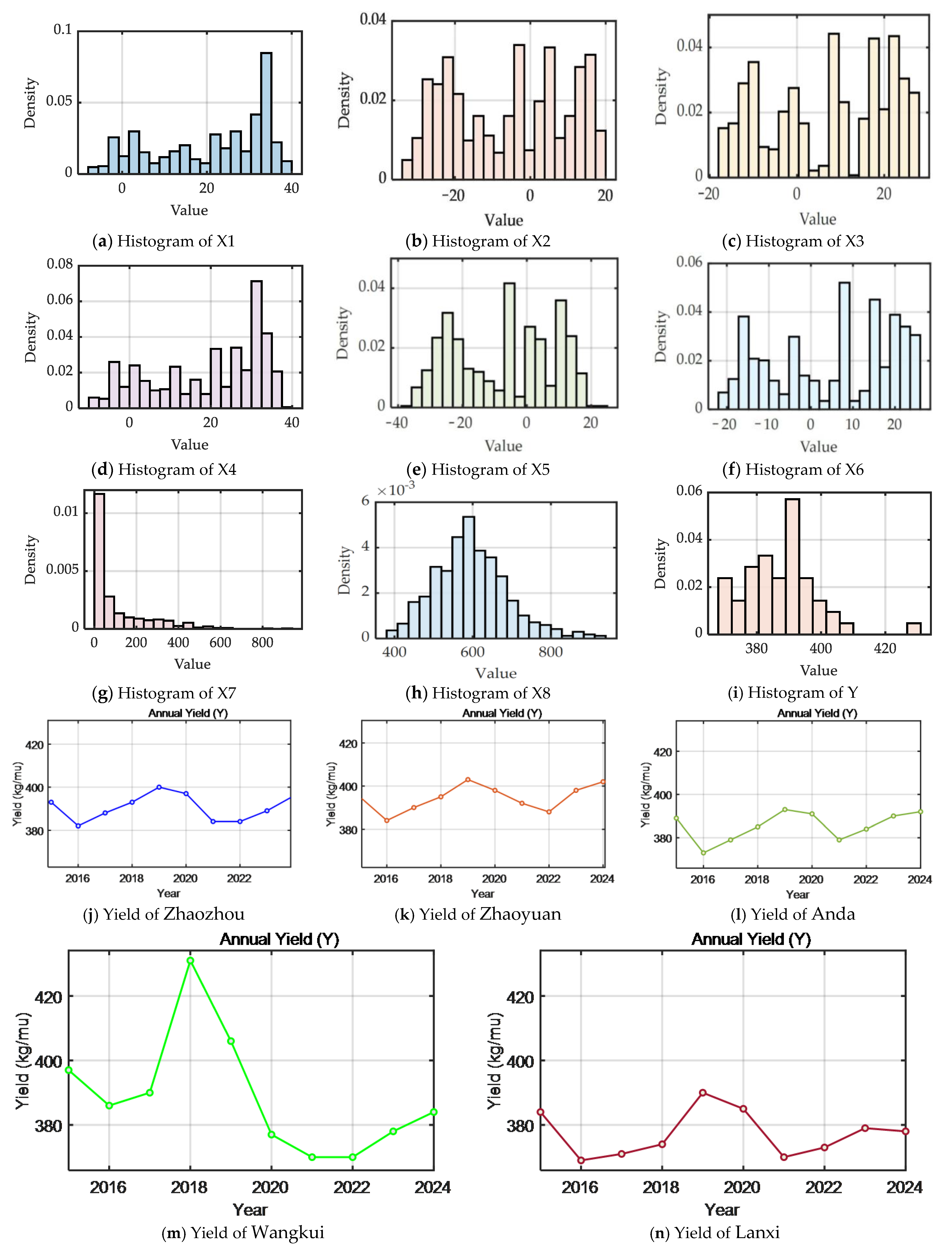With regard to central tendency and distribution characteristics, the mean values of soil and air temperatures are found to fall within typical ranges for the Northeast region. The standard deviations range from 13 to 16, with minimum and maximum values extending across the entire period from the cold season to the warm season. The skewness value is marginally negative or near to zero, while the kurtosis value approaches a medium peak. This indicates that the temperature sequence distribution is relatively flat, with few extreme values. The monthly precipitation averages at approximately 101.39 mm, with a lower quartile of 4.65, median of 32.45, upper quartile of 147.10, and maximum value of 921.00. This distribution exhibits pronounced right-skewedness and kurtosis, indicating a significant influence of extreme precipitation events on the overall distribution. The average soil moisture content was found to be approximately 597.02, with a standard deviation of 94.69 and a quartile range of 531.15–650.75. The presence of moderate right-skewness is indicative of dual influences from precipitation and soil texture. The mean annual per unit area yield was found to be 387.36, with a standard deviation of 11.39. The interquartile range was concentrated between 379 and 393, exhibiting positive skewness and high kurtosis, suggesting that a small number of high-per-unit-area-yield years elevated the upper tail. Histograms for each variable and the distribution of annual per unit area yields across regions are shown in Figure 3. (One hectare is equivalent to 15 mu of land).