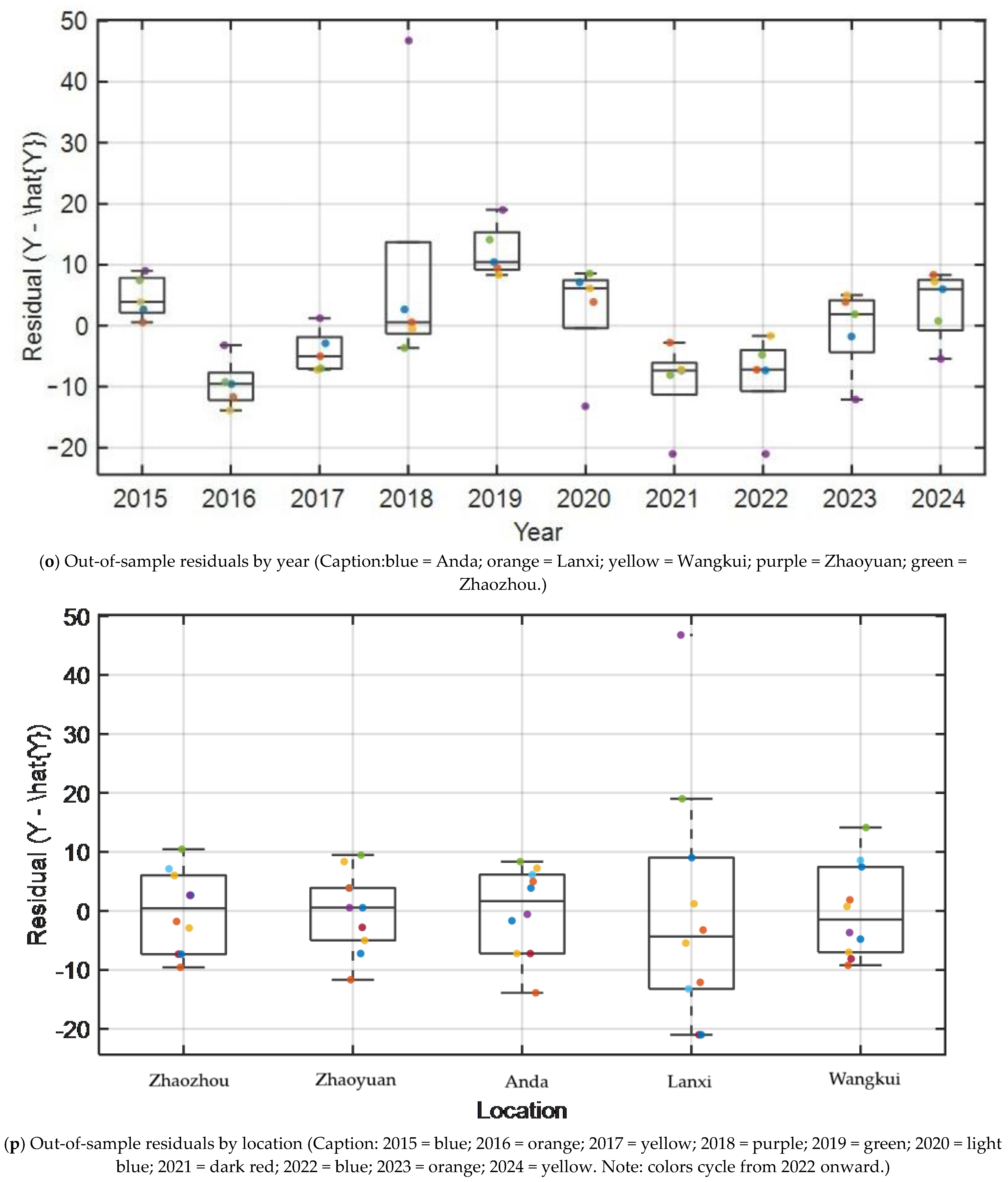 Time series comparisons demonstrate the convergence process of eight rolling forecasts relative to final actual per unit area yields, presenting monthly error reduction curves to examine lead time and stability. Spatial distributions are also compared through box plots and residual histograms of annual residuals across six locations to identify systematic biases. The model’s stability in terms of spatial and temporal generalization will be determined by the achievement of an R2 > 0.75 and an MAPE < 8 in 2024, whilst maintaining error levels that are comparable to those of the five primary regions in Fangzheng County. In the event that spatial residuals demonstrate significant bias, this information should be communicated to the Feature Engineering team. It is imperative to prioritize the augmentation of piecewise splines and threshold terms for X8, whilst concomitantly introducing piecewise aggregation of temperature and precipitation within pivotal phenological windows. This will serve to enhance adaptation to extreme climatic conditions.