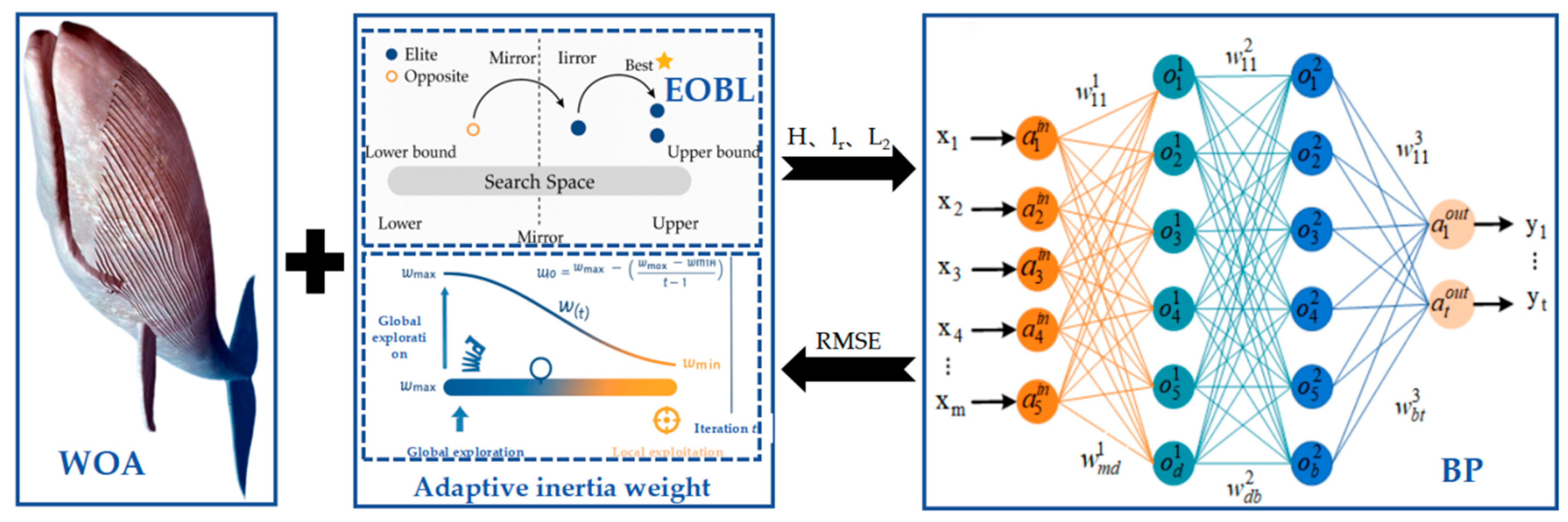 The original WOA relies on a linearly decreasing coefficient, a, to switch between exploration and exploitation. In the context of high-dimensional, non-convex error surfaces, this approach is susceptible to a number of issues, including monotonous step sizes, diminished population diversity, and premature convergence. These issues can result in degraded quality in the context of BP hyperparameter optimisation [23,24,25]. In order to address the aforementioned issues, this paper introduces two complementary mechanisms into WOA. The following terms are employed in this text: adaptive inertia weight [26] and elite opposition-based learning (EOBL) [27]. These mechanisms are designed to balance global exploration with local digging, thereby mitigating local optima. The calculation formulas employed are as follows: