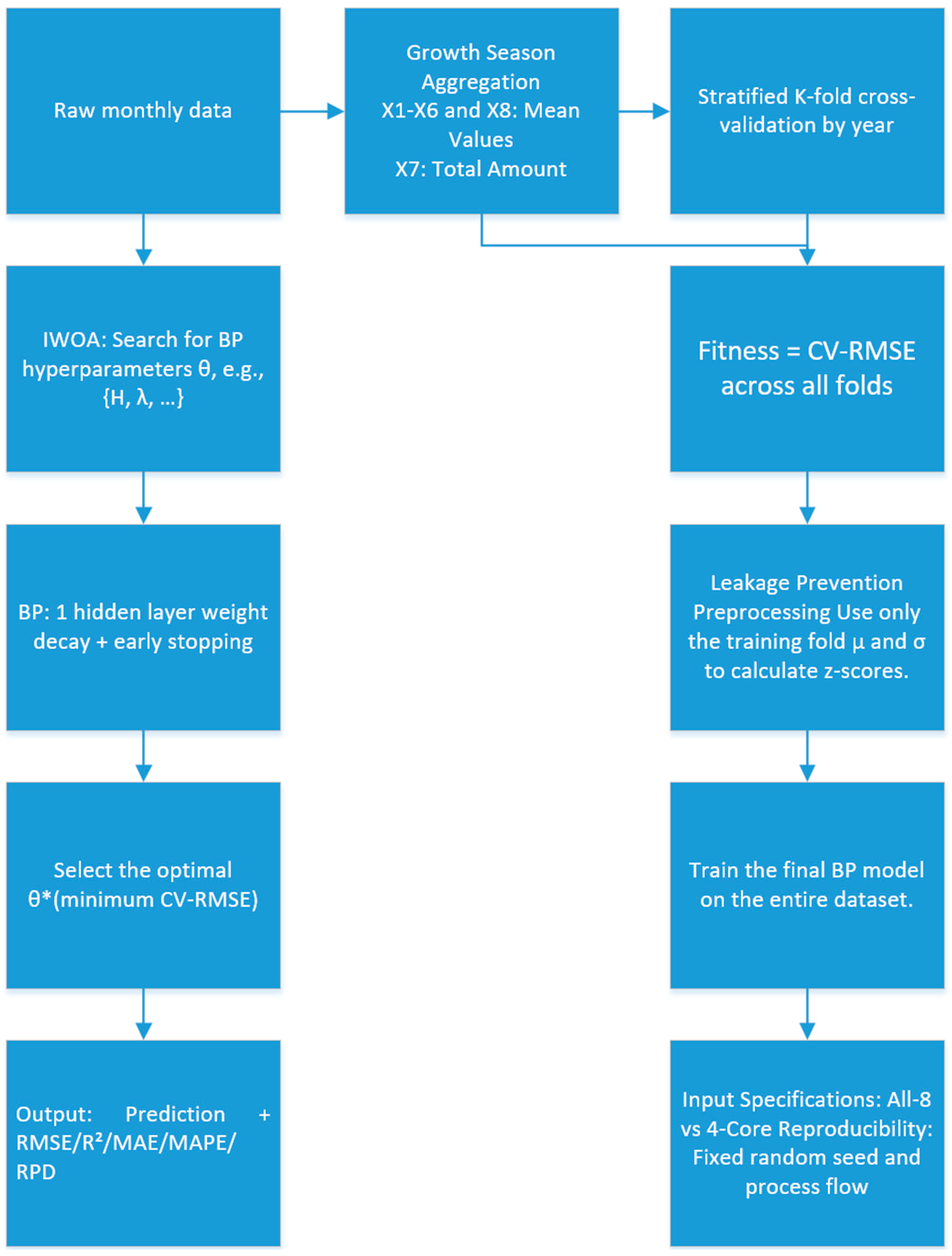 Figure 6 summarizes the IWOA–BP workflow and leakage-safe validation. Monthly meteorological and soil variables are aggregated into growing-season statistics for May to September, with temperature and soil moisture summarized by their means and precipitation by its seasonal total. The outer IWOA loop searches the BP hyperparameters, such as the hidden layer width and the strength of weight decay, and evaluates each setting using year-stratified K-fold cross-validated RMSE with z-scoring computed from the training folds only, a single-hidden-layer BP, weight decay, and early stopping. The best hyperparameter configuration is then used to train the final model on the full dataset, and we report RMSE, R-squared, MAE, MAPE, and RPD, with results compared between the All-8 and 4-Core input specifications.