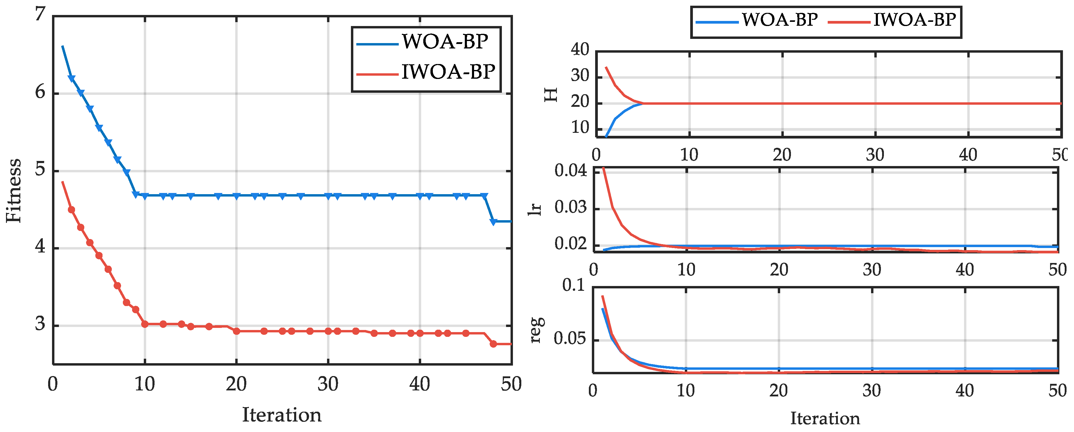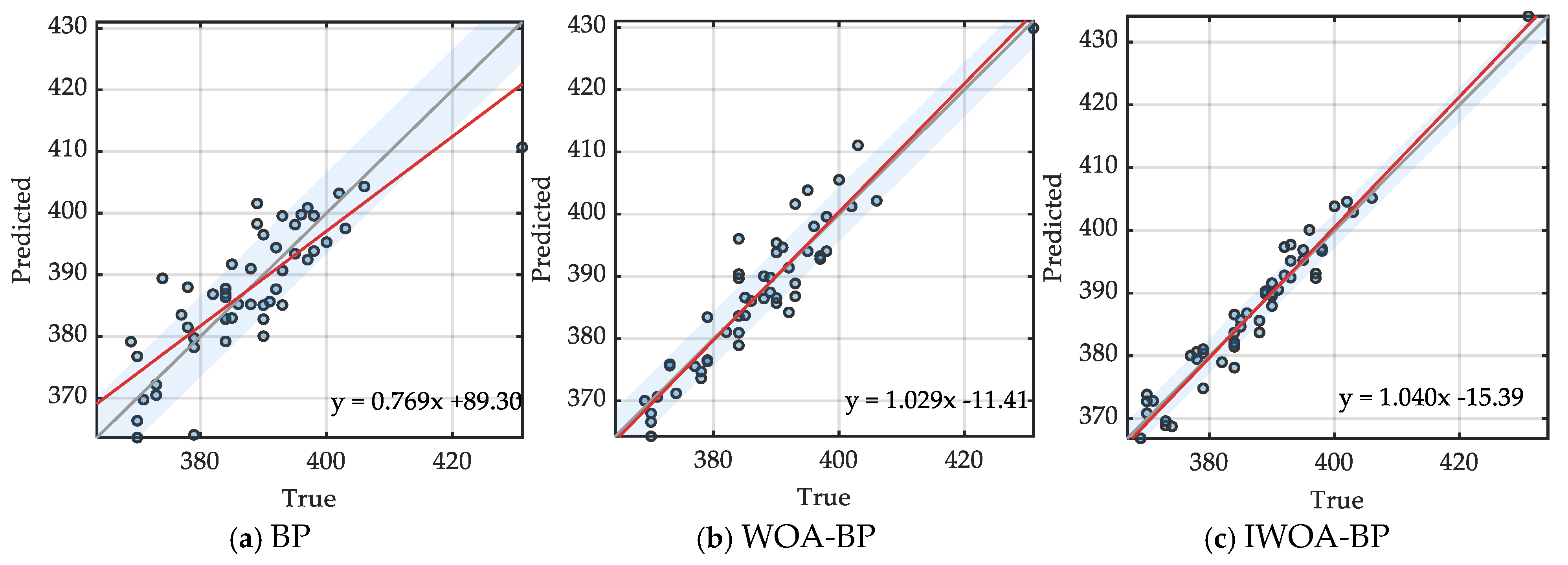 Hyperparameter tuning boundaries were consistent. The hidden layer node counts ranged from 5 to 40, the learning rates from 1 × 10−3 to 1 × 10−1, and the regularization coefficients (reg) from 0 to 0.10, with a maximum of 50 iterations. The population sizes for WOA and IWOA were set to 20. BP employed Levenberg–Marquardt training with early stopping and weight decay enabled. The output fitness convergence curves were utilised to compare optimisation speed and stability. Three-dimensional hyperparameter trajectories illustrate divergence in convergence paths. The utilisation of composite radar charts facilitates a comprehensive evaluation of the performance across a range of metrics, including RMSE, R2, MAE, MAPE, and RPD. Scatter plots of validation data points overlaid on a unit line and a least-squares fitted line provide the slope, intercept, and correlation coefficients.