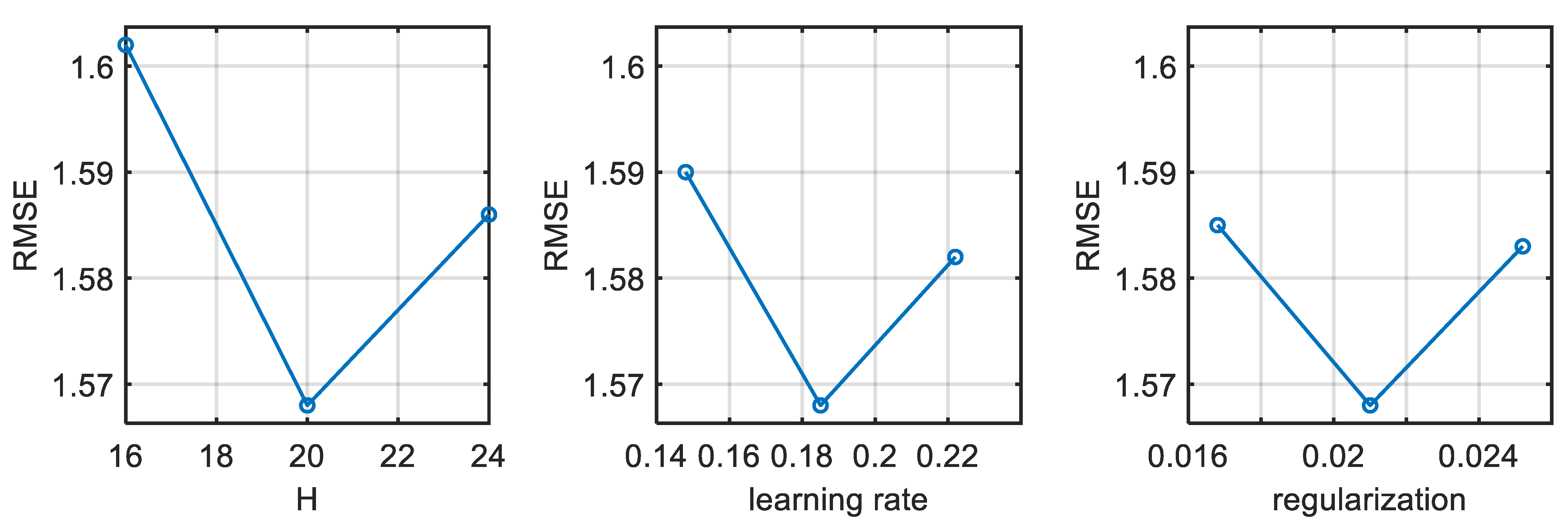 Figure 10. Hyperparameter sensitivity of RMSE to H, learning rate, and regularization.