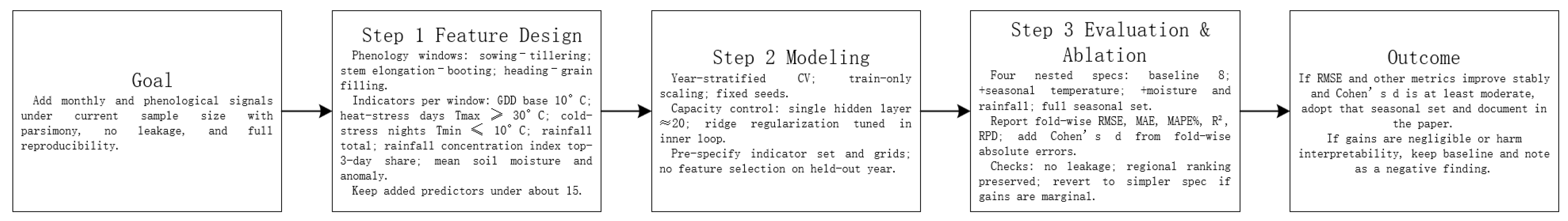 The modelling strategies employed must achieve a balance between maintaining information fidelity and adhering to redundancy constraints. It is hypothesised that the X6 and X7 may serve as core inputs, with the X3 and X5 providing supplementary data as required, in order to characterise root-zone thermal environments and cold stress risks. Nonlinear feature engineering of X8, incorporating quadratic terms or piecewise spline functions, has been demonstrated to be a highly effective method for capturing potential optimal range effects and threshold responses. During the training process, robust standardization and mild de-extremisation procedures should be implemented. In order to mitigate the risks of information leakage, cross-validation stratified by city or year should be employed, in combination with weight decay and early stopping to suppress overfitting. It is imperative to acknowledge that the process of annual aggregation has the potential to diminish the strength of signals during critical growth periods. Subsequent work may incorporate monthly scales and lag term to characterise the time-delayed effects of rainfall and soil moisture, thereby further optimising factor selection and hyperparameter tuning for the prediction model. We assessed collinearity among temperature predictors using variance inflation factors computed within each fold on training data only under year-stratified cross-validation. All retained variables showed VIF values below the commonly used thresholds. As a robustness check, we trained a ridge regression baseline with the penalty tuned by inner cross-validation on the training folds and evaluated on the corresponding validation folds. The ridge results matched the main specification in both error levels and predictor ordering.