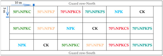 The experiment was arranged in a completely randomized block design with six treatments: (1) no fertilizer (CK); (2) local chemical fertilizer (NPK); (3) 50% of NPK plus pig manure (50%NPKP); (4) 50% of NPK plus cattle manure (50%NPKC); (5) 70% of NPK plus pig manure and straw return (70%NPKPS); (6) 70% of NPK plus cattle manure and straw return (70%NPKCS). Each treatment was replicated in three plots, and each plot (5 m × 10 m) was randomly allocated within blocks, each with an area of 50 m2 (Figure 1). The wheat cultivar was sown at 195 kg ha−1 with 15 cm row spacing. The maize cultivar was planted at 60,000 plants ha−1 with 60 cm row spacing. Other agronomic practices and pest and disease management were carried out according to local methods. All field management measures and irrigation conditions were consistent, except for the inconsistent fertilization treatments and the amounts of straw return.