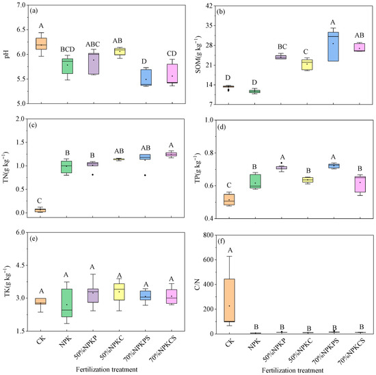 Soil basic chemical properties under the six fertilization treatments: (a) represents the values of soil pH; (b) represents the values of soil organic matter (SOM); (c) represents the values of total nitrogen (TN); (d) represents the values of total phosphorus (TP); (e) represents the values of total potassium (TK); (f) represents the ratio of soil organic carbon and total nitrogentotal potassium (C/N). CK, no fertilizer; NPK, chemical fertilizer; 50%NPKP, 50% of chemical fertilizer and pig manure; 50%NPKC, 50% of chemical fertilizer and cattle manure; 70%NPKPS, 70% of chemical fertilizer plus pig manure and straw return; 70%NPKCS, 70% of chemical fertilizer plus cattle manure and straw return. Values followed by different capital letters in a column indicate significant differences among treatments (p < 0.05).