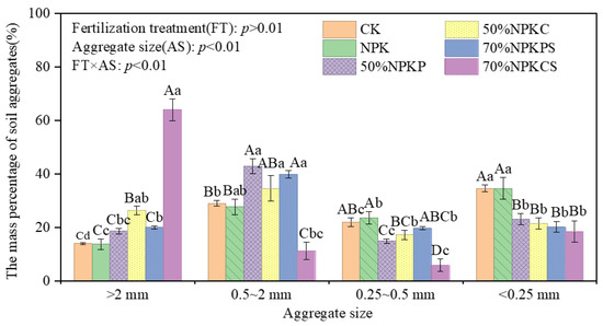 The mass percentage of soil aggregates of different sizes as affected by fertilization treatments. CK, no fertilizer; NPK, chemical fertilizer; 50%NPKP, 50% of chemical fertilizer and pig manure; 50%NPKC, 50% of chemical fertilizer and cattle manure; 70%NPKPS, 70% of chemical fertilizer plus pig manure and straw return; 70%NPKCS, 70% of chemical fertilizer plus cattle manure and straw return. Different uppercase letters in the bars represent significant differences among fertilization treatments for the same aggregate size (p < 0.05); different lowercase letters in the bars represent significant differences among aggregate sizes for the same fertilization treatment (p < 0.05).