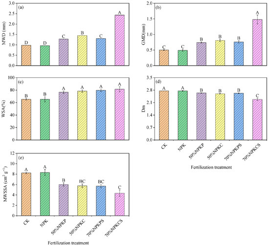 Soil aggregate stability indexes under the six fertilization treatments: (a) represents the values of mean weight diameter (MWD); (b) represents the values of geometric mean diameter (GMD); (c) represents the values of >0.25 mm water-stable aggregate content (WSA); (d) represents the values of fractal dimension (Dm); (e) represents the values of mean weight-specific surface area (MWSSA). The error bars are three standard errors of the means (n = 3). CK, no fertilizer; NPK, chemical fertilizer; 50%NPKP, 50% of chemical fertilizer and pig manure; 50%NPKC, 50% of chemical fertilizer and cattle manure; 70%NPKPS, 70% of chemical fertilizer plus pig manure and straw return; 70%NPKCS, 70% of chemical fertilizer plus cattle manure and straw return. Different uppercase letters above the bars indicate significant differences among treatments (p < 0.05).