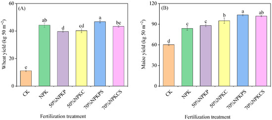 Crop yields under the six fertilization treatments: (A) represents the yields of wheat; (B) represents the yields of maize. The error bars are three standard errors of the means (n = 3). CK, no fertilizer; NPK, chemical fertilizer; 50%NPKP, 50% of chemical fertilizer and pig manure; 50%NPKC, 50% of chemical fertilizer and cattle manure; 70%NPKPS, 70% of chemical fertilizer plus pig manure and straw return; 70%NPKCS, 70% of chemical fertilizer plus cattle manure and straw return. Different lowercase letters above the bars indicate significant differences among treatments (p < 0.05).