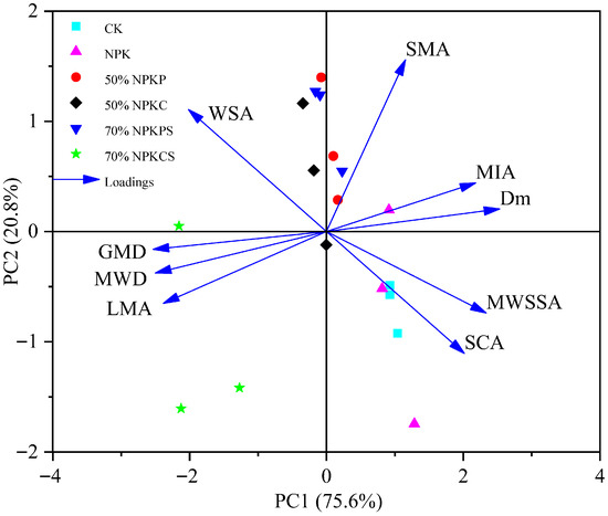 The loading analysis indicated that MWSSA and SCA were located in the lower-right quadrant, positively associated with CK and NPK. Conversely, GMD, MWD, and LMA were in the lower-left quadrant, strongly linked to the 70%NPKCS treatment. WSA was positioned in the upper-left quadrant, while SMA, MIA, and Dm were in the upper-right quadrant.
