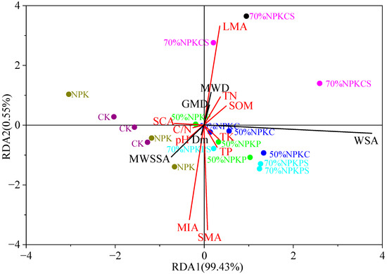 In the RDA biplot, the six fertilization treatments were clearly separated along RDA1. The 70%NPKCS treatment was located in the upper-right quadrant and was strongly associated with key aggregate stability parameters such as MWD and GMD, as well as LMA and soil nutrients including TN and SOM. In contrast, the 50%NPKP, 50%NPKC, and 70%NPKPS treatments clustered in the lower-right quadrant, showing closer relationships with TK and TP. The remaining treatments (CK and NPK) were distributed on the left side of the x-axis (RDA1 ≈ 0). Meanwhile, parameters such as MWSSA, Dm, pH, C/N, and MIA were grouped in the lower-left quadrant, reflecting their negative correlations with aggregate stability and association with unamended or mineral-only fertilization.