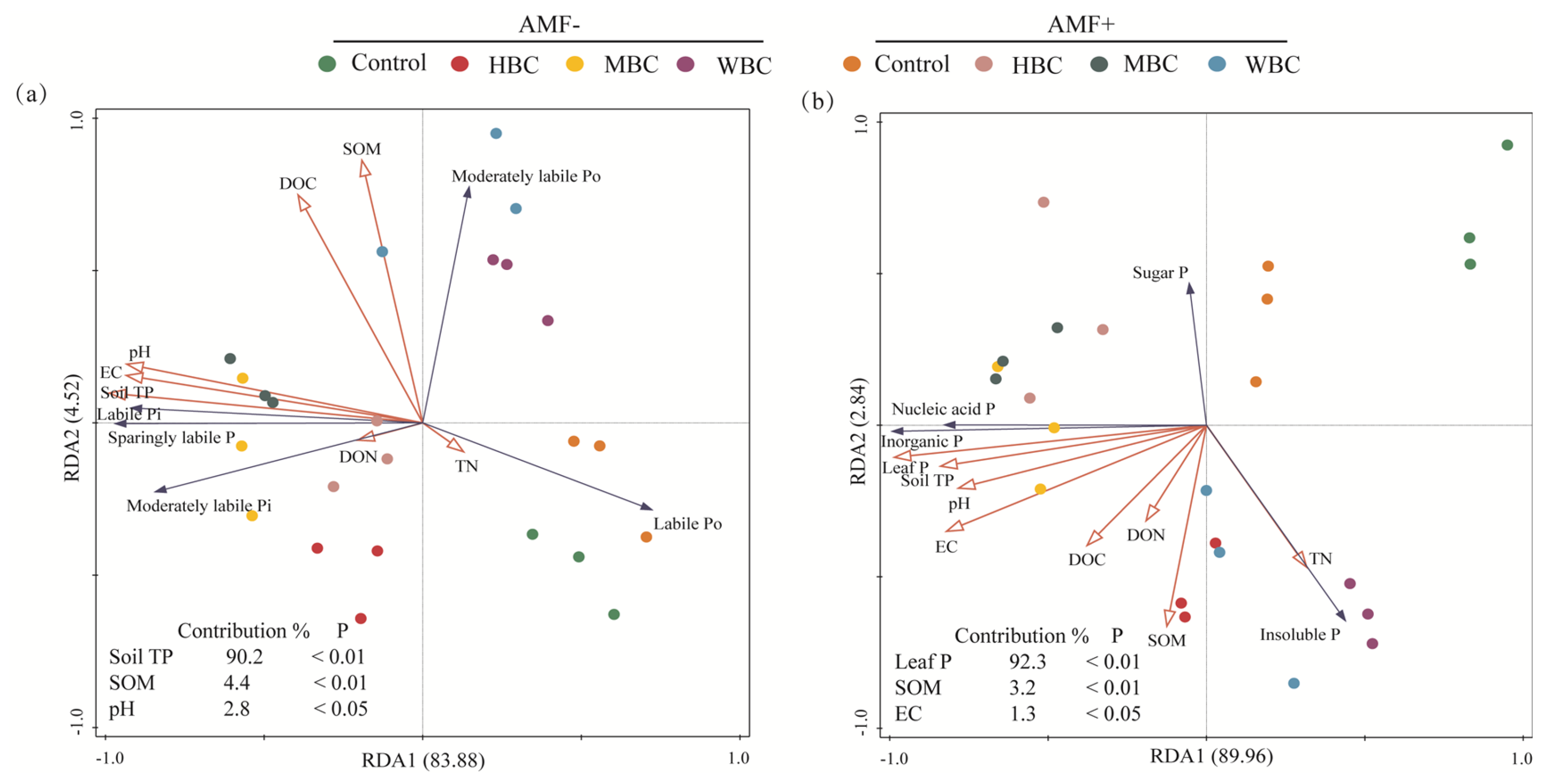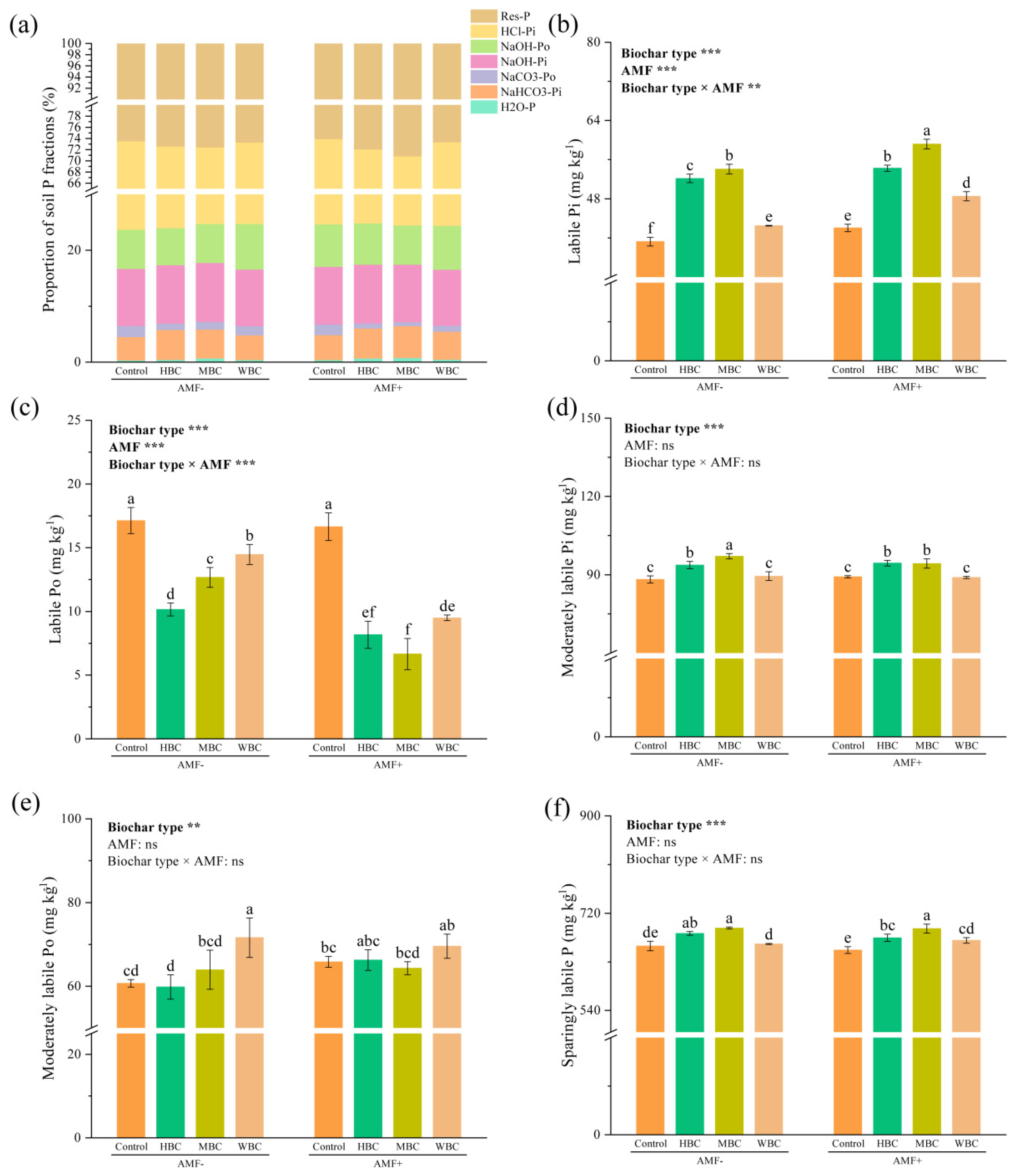 4.1. Effects of Biochar Combined with AMF on Soil P Fractions
