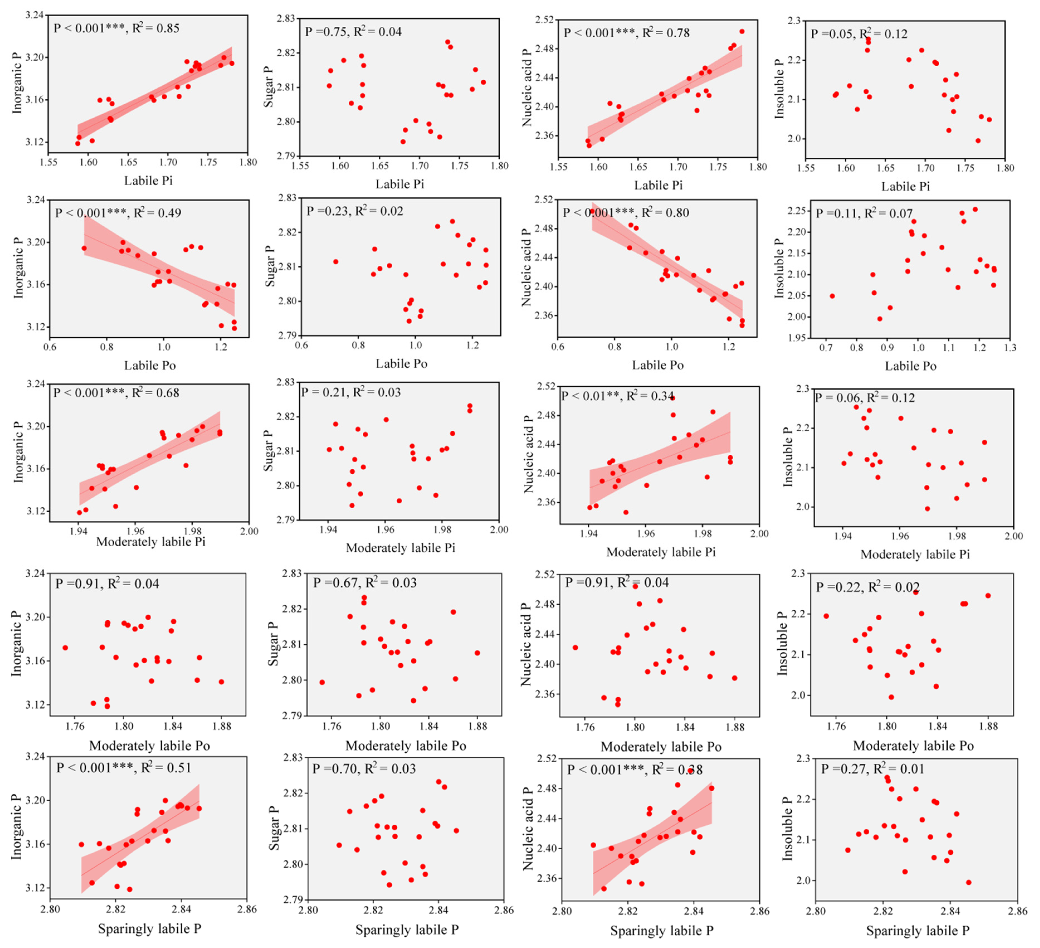3.6. Linear Relationship Between Leaf P Chemical Forms and Soil P Fractions