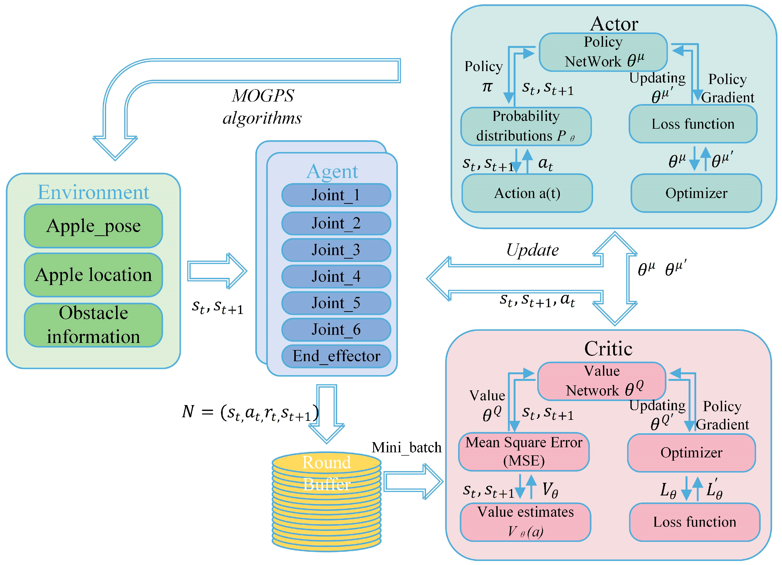 Figure 2. This state consists of the position and orientation of the apples, as well as information about the obstacles. In the network architecture, two independent agents represent the left arm and the right arm, respectively. These agents read the joint state information of the dual-arm robot, denoted as