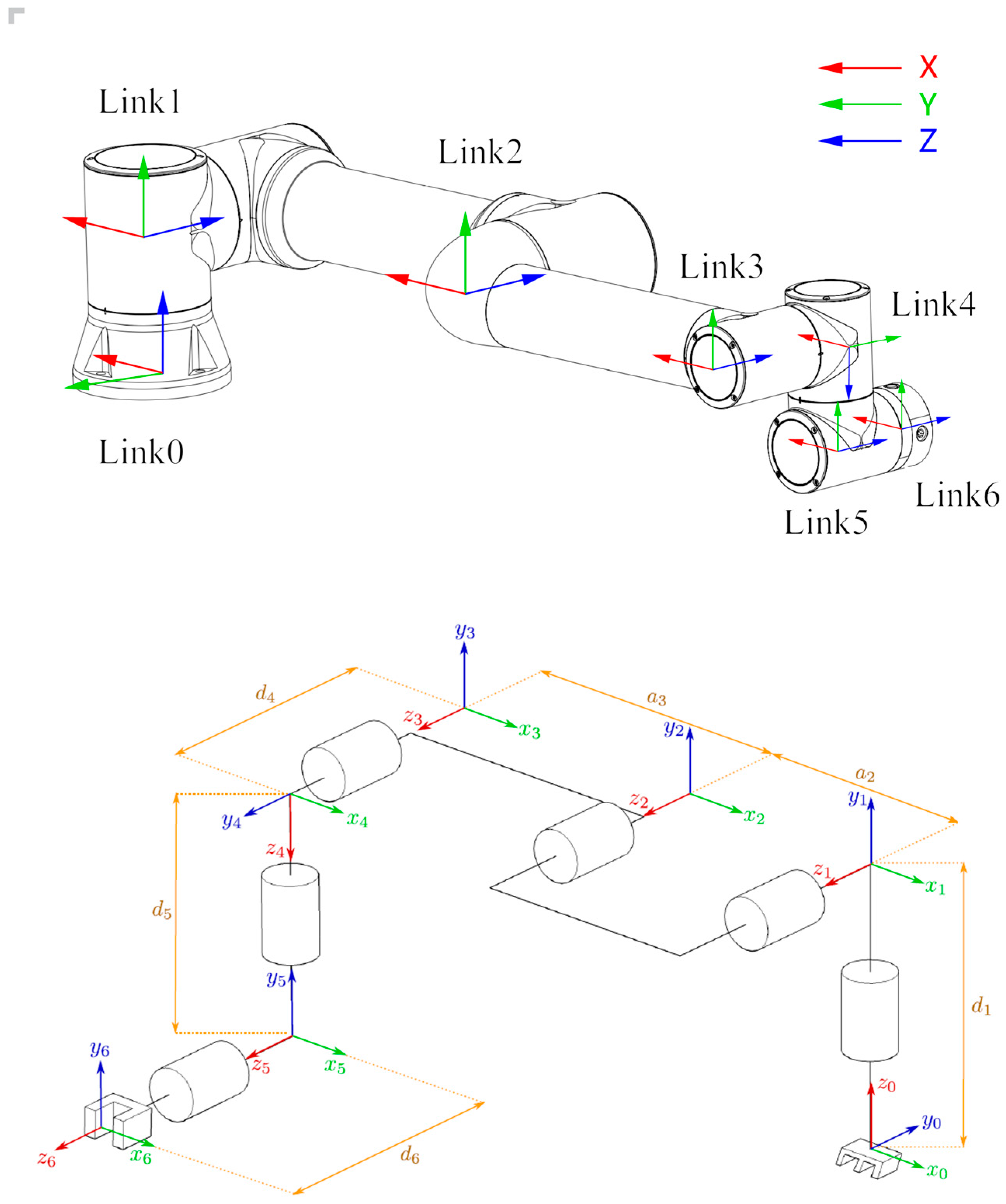 In the DH parameters, , , , and denote the joint angle, link length, joint distance, and link twist angle, respectively.