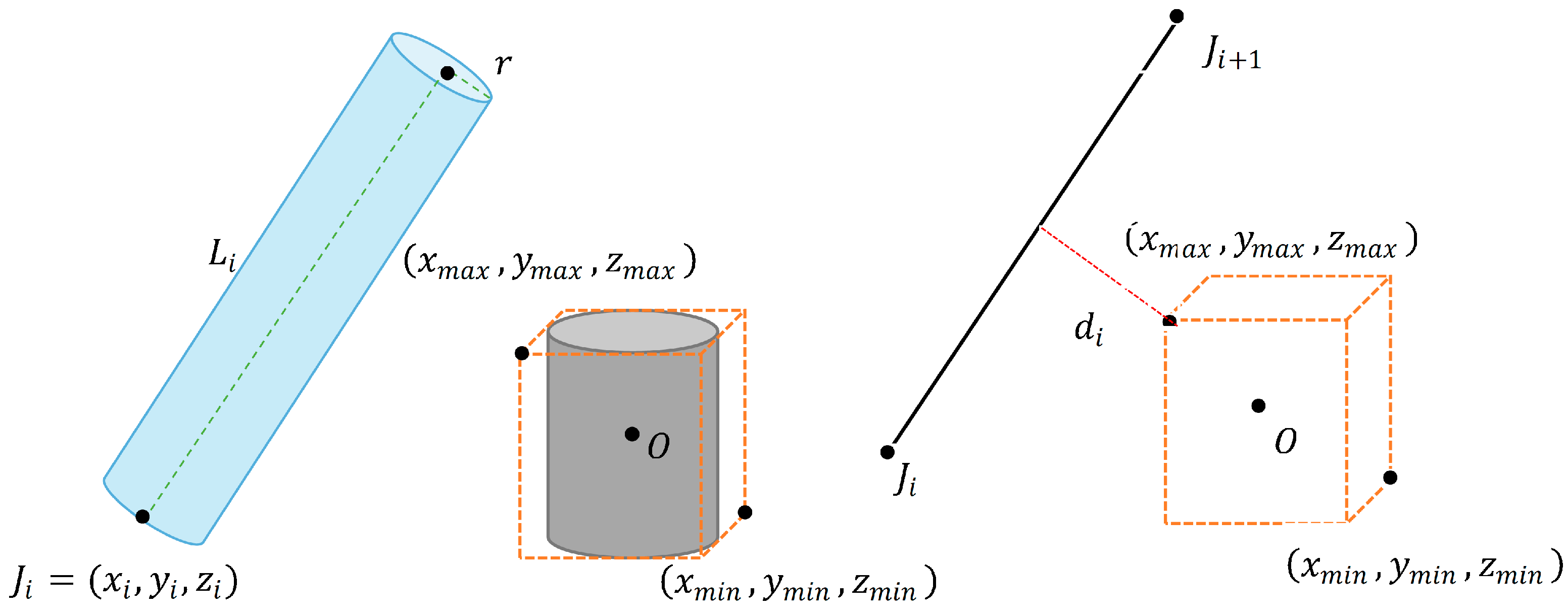 In collision detection algorithms, an axis-aligned bounding box model is employed to approximate obstacles for improved computational efficiency. This cuboid is uniquely defined by its minimum and maximum corner coordinates, which simplifies subsequent calculations