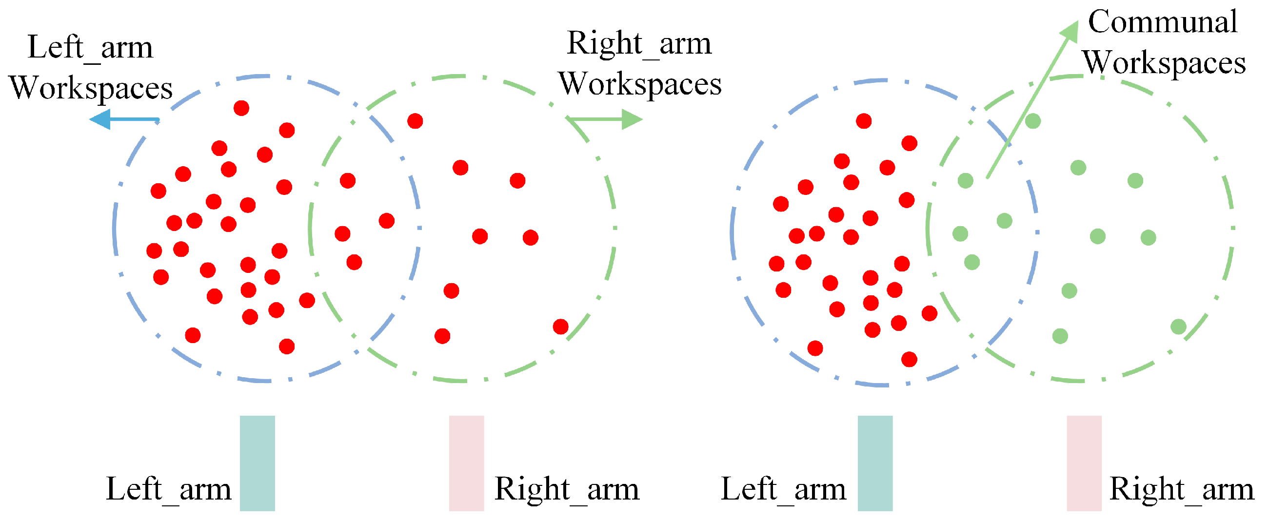 Figure 5, targets located within the shared workspace of both arms are dynamically assigned to either the left or right arm for execution. The specific allocation rule is as follows: for the same target, the comprehensive scores derived from its interaction models with the left and right arms are compared, and the arm with the higher score is granted the grasping privilege for that target.