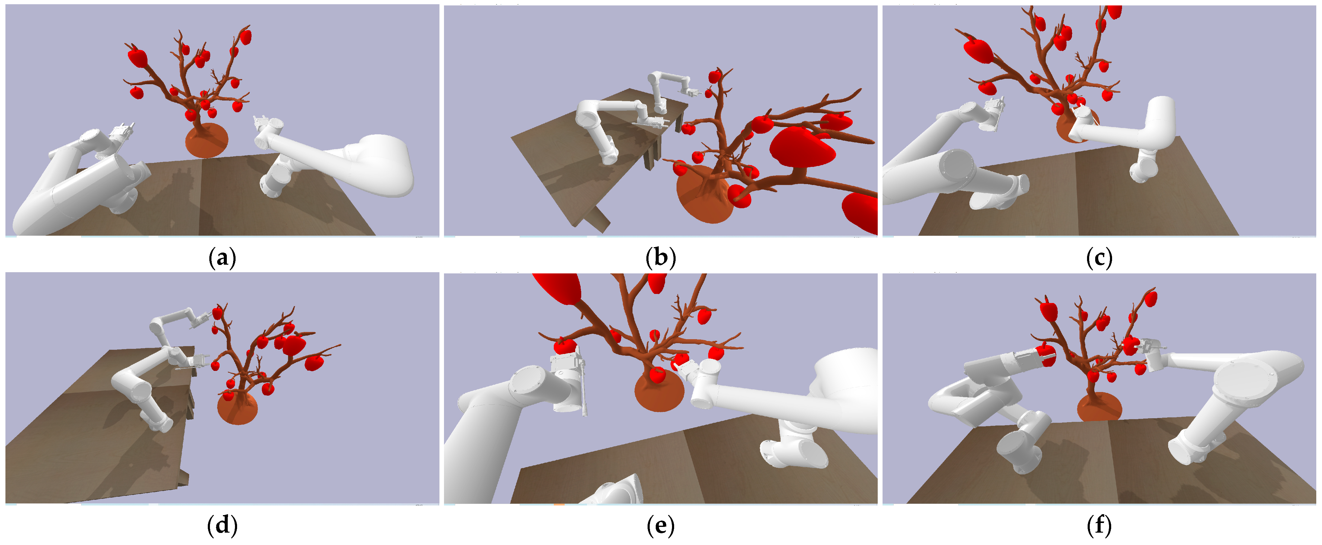 Table 6. In this setup, the robotic arms serve as the actuators, while the depth camera is responsible for environmental perception and target localization. The software system is built on the Robot Operating System framework, integrating modules for visual perception, pose estimation, motion planning, and control, which achieves a complete closed loop for the algorithm from simulation to physical hardware. Furthermore, to minimize damage to the fruit during the picking process, the end-effector employs an adaptive gripper featuring compliant gripping characteristics.