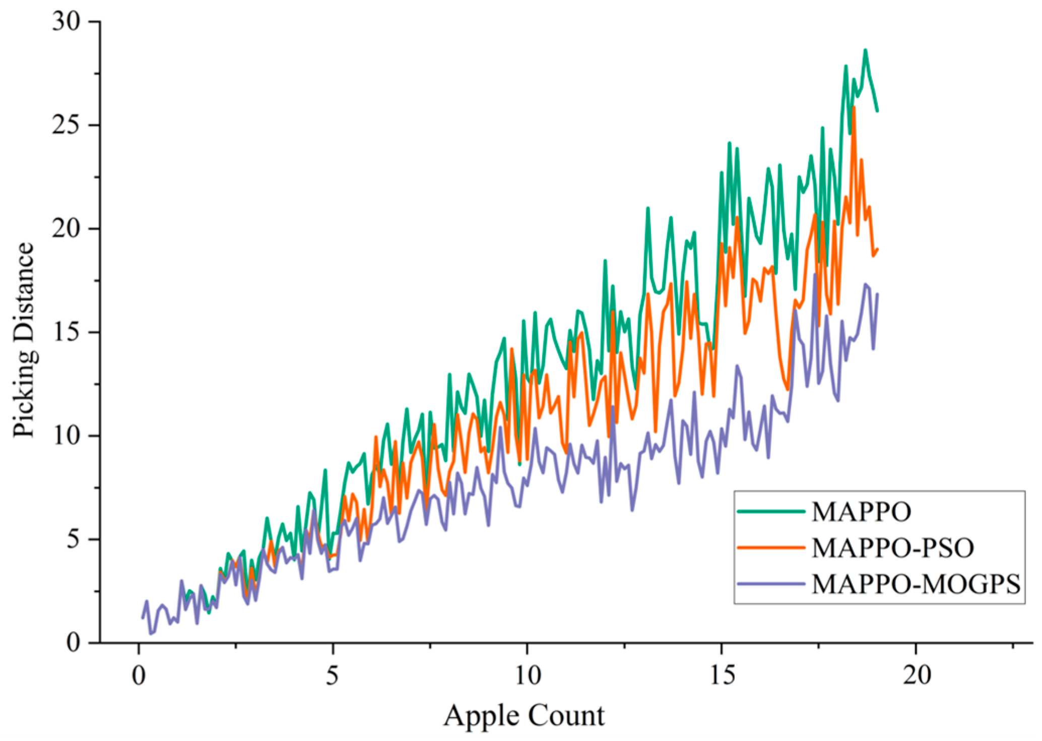 30], dynamically optimizing the picking path. The MOGPS algorithm considers the uneven distribution of fruit and the complexity of the working environment, dynamically allocating tasks and optimizing paths for the dual arms. Simulation experiments have verified the adaptability and path optimization capabilities of the MAPPO-MOGPS algorithm in a simulated apple picking environment. Additionally, experiments were conducted on the MAPPO-MOGPS algorithm in a real-world picking scenario, combined with a visual perception system [