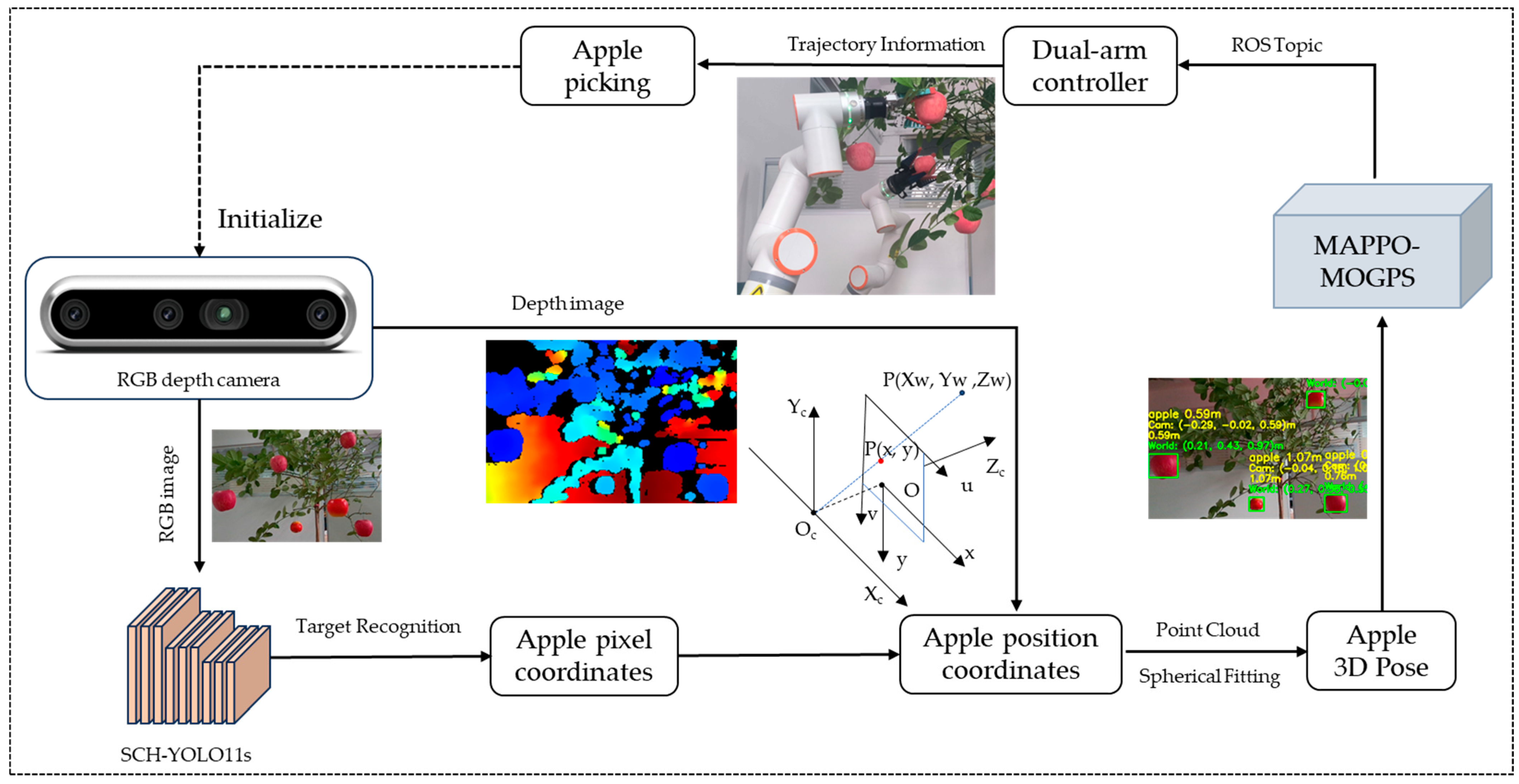 To achieve efficient and safe dual-arm collaborative apple harvesting, this study designs an innovative strategy that integrates Multi-Agent Proximal Policy Optimization, a multi-objective greedy target selection mechanism, and a dynamic collision risk term. This section aims to outline the overall framework and the underlying rationale of the proposed methodology. Specifically, MAPPO serves as the underlying learning architecture, facilitating coordinated policy learning through parameter sharing between the agents. The multi-objective greedy selection mechanism is responsible for real-time task allocation and fruit target decision-making in complex environments. Meanwhile, the dynamic collision risk term is incorporated into the motion planning to explicitly avoid collisions between the arms and with environmental obstacles. Together, these components form a comprehensive decision-making system. By enabling real-time decision-making, the proposed approach enhances the coordination between the dual arms and their adaptability to dynamic environments.
