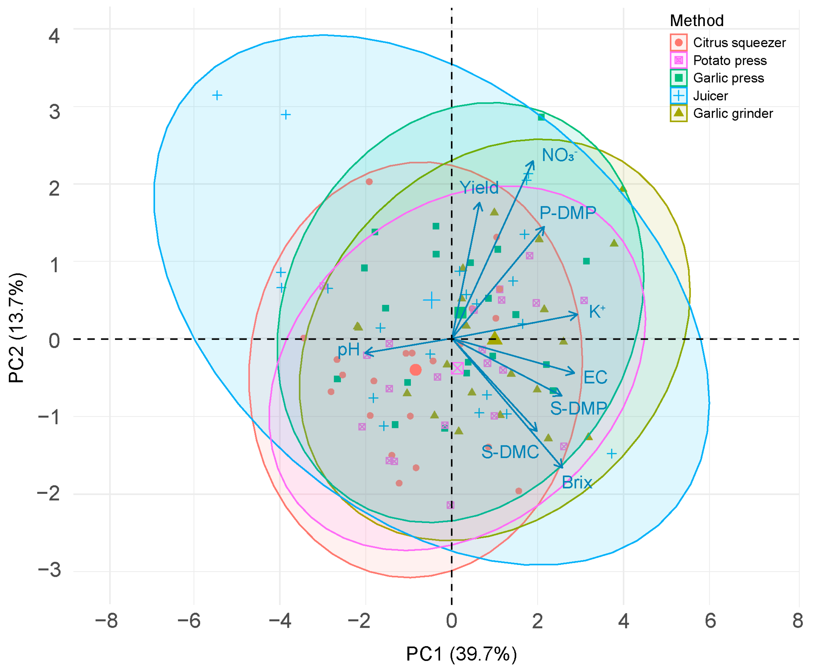 | Juicer | 213.22 ± 8.02 (c) | 4.96 ± 0.12 (ab) | 60.76 ± 1.77 (ab) |